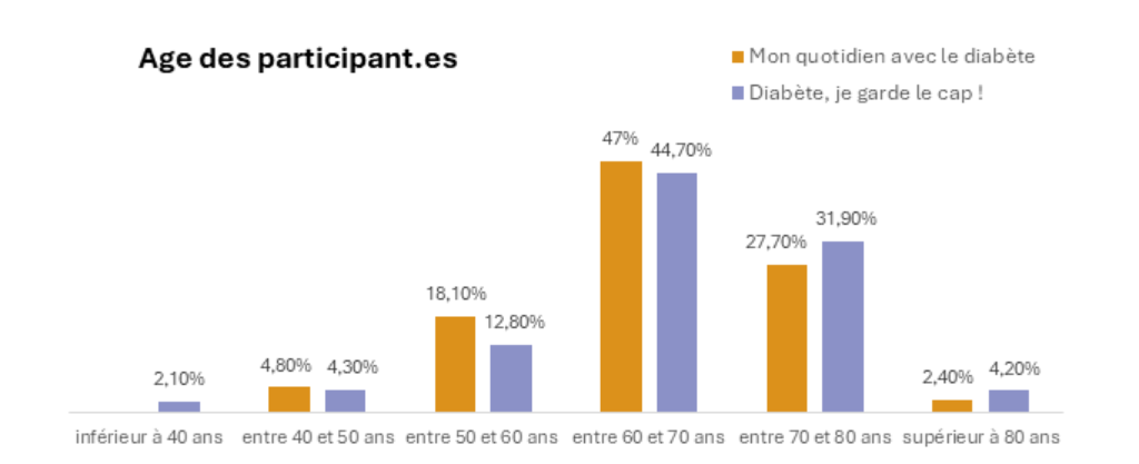 On note un âge de patients participant aux 2 programmes superposable. La majeure partie des patients à plus de 60 ans (de l'ordre de 80 %). Cela est cohérent avec la pyramide des âges du diabète de type 2.