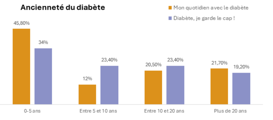 On note une ancienneté du diabète plus précoce chez les patients participant au programme initial Mon quotidien avec le diabète, ce qui est logique puisque le programme de renforcement Diabète, je garde le cap ! vient dans un second temps.