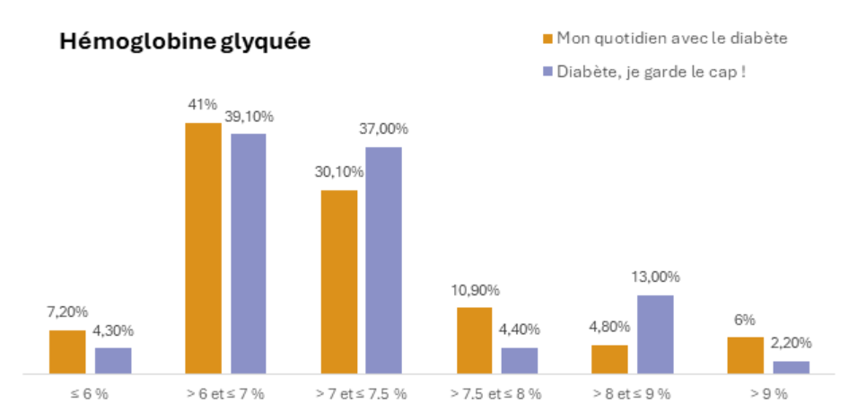 La moitié ont un diabète bien équilibré avec une hémoglobine glyquée < 7 % et la moitié ont un équilibre insuffisant avec une hémoglobine glyquée > 7 %.